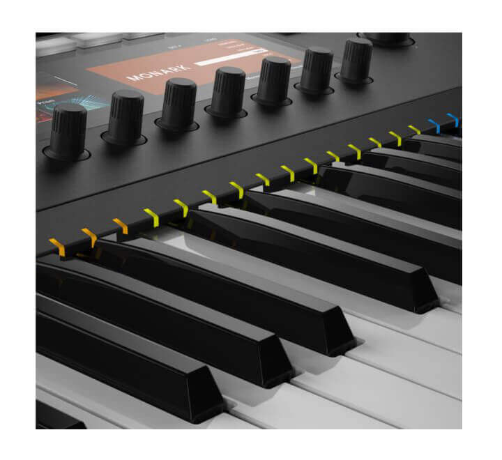 El CONTROLADOR MIDI KOMPLETE KONTROL S61 MK2 presenta dos pantallas de alta resolución a color proporcionan información esencial sobre sonidos y proyectos. Además los botones de función retroiluminados varían de color e intensidad para indicar su estado, y los LEDs Light Guide marcan la ubicación de sonidos, zonas de teclado, teclas modificadoras.