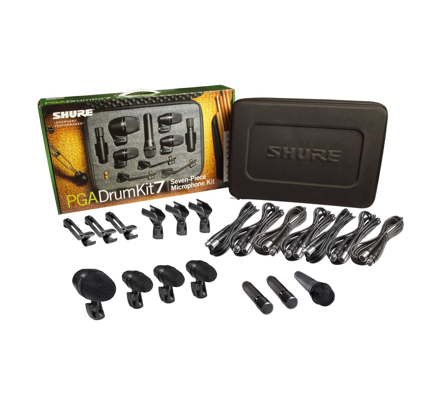 – Un micrófono de bombo PGA52, tres micrófonos de bombo PGA56, un micrófono de instrumento PGA57 y dos micrófonos de instrumento PGA81, junto con tres soportes de bombo y siete cables XLR-XLR y un estuche de transporte.
