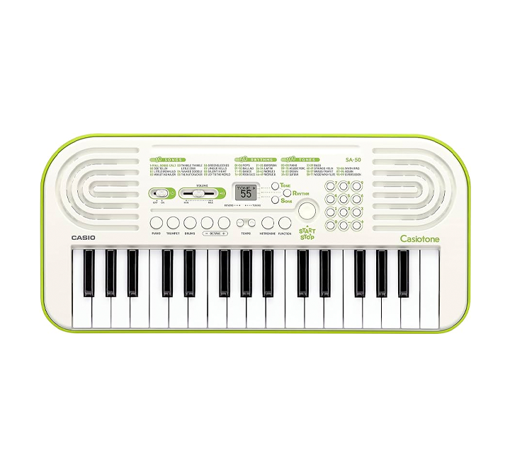 El TECLADO CASIO SA-50 incorpora 32 teclas pequeñas que facilitan su uso, incluso para manos pequeñas. Ademas 100 tonos incorporados de alta calidad que cubren una amplia gama de instrumentos, como piano, vientos, percusión y muchos otros, extraídos de instrumentos acústicos reales. Los botones de tono directo le permiten seleccionar tonos de piano, trompeta o batería con un solo toque